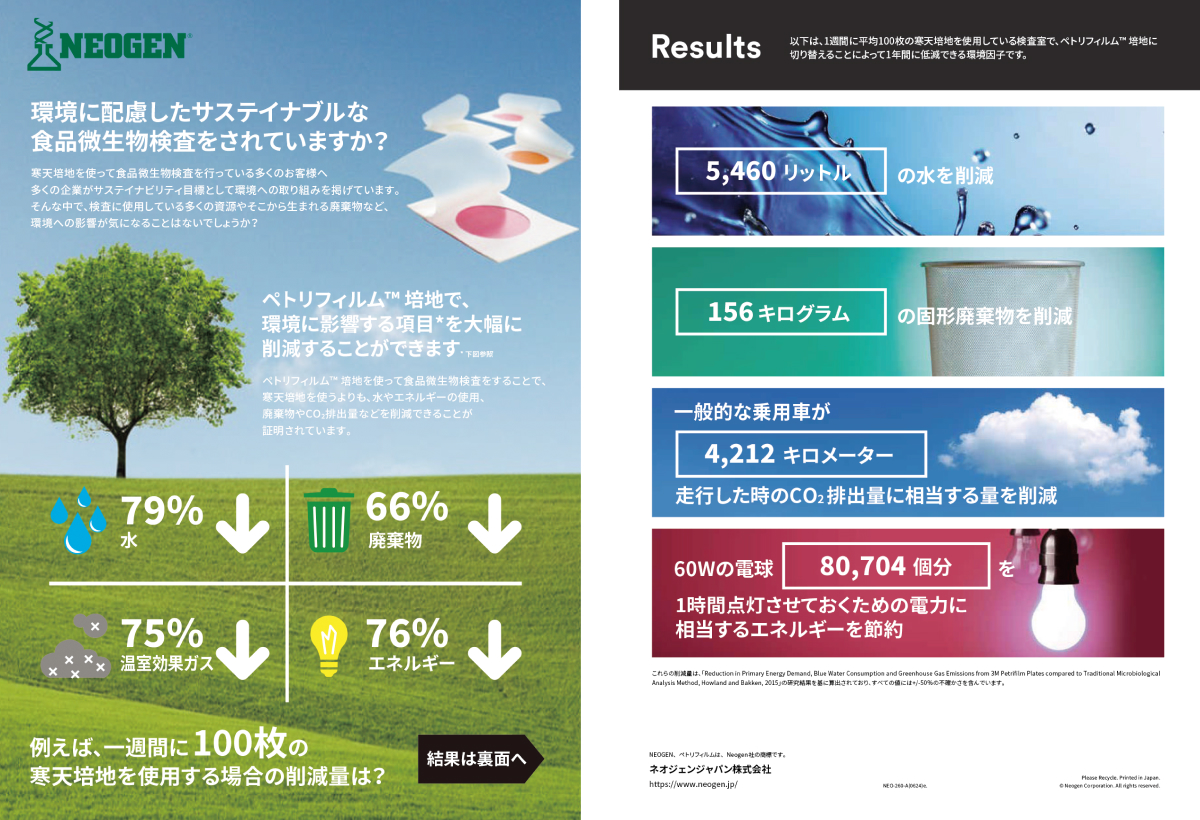 病原菌自動検出システムや、ペトリフィルム™︎ 培地で食品微生物検査を行うと、水やエネルギーの使用、廃棄物やCO2排出量などを削減できます。