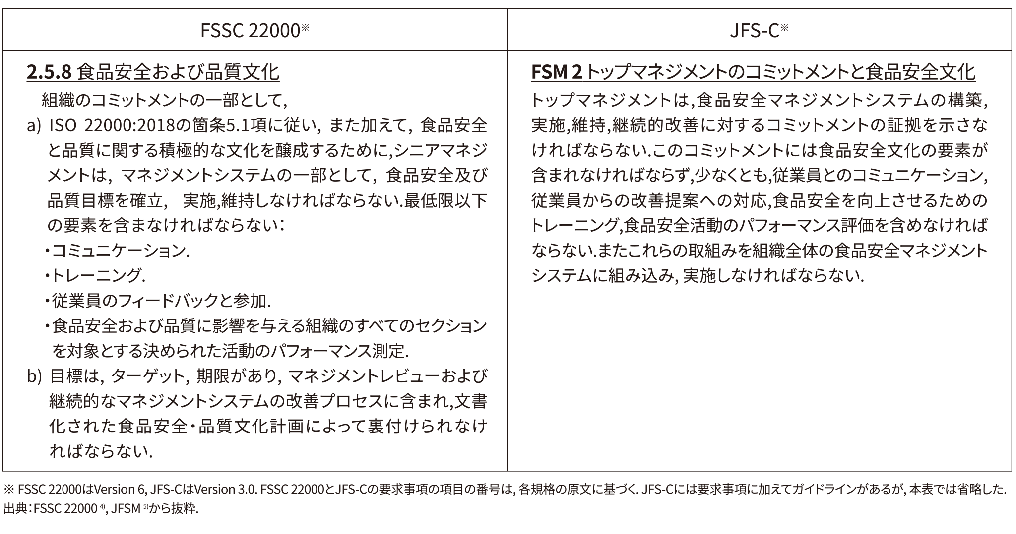 表 FSSC 22000とJFS-Cにおける食品安全文化に関する要求事項