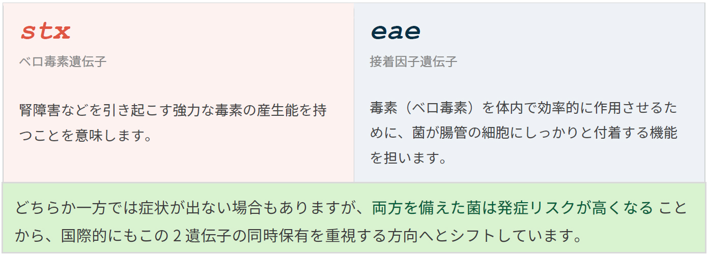 こうした状況を受け、欧米では「O抗原の種類にとらわれず、菌が病原性を持っているかという本質で見極める」方法へと移行してきています。具体的には、ベロ毒素を作る遺伝子(stx)と、腸管に付着するための遺伝子(eae)を同時に保有しているかどうかを検出するスクリーニング法です。この2つの遺伝子の組み合わせこそが、人に対して病原性を発現する鍵となります